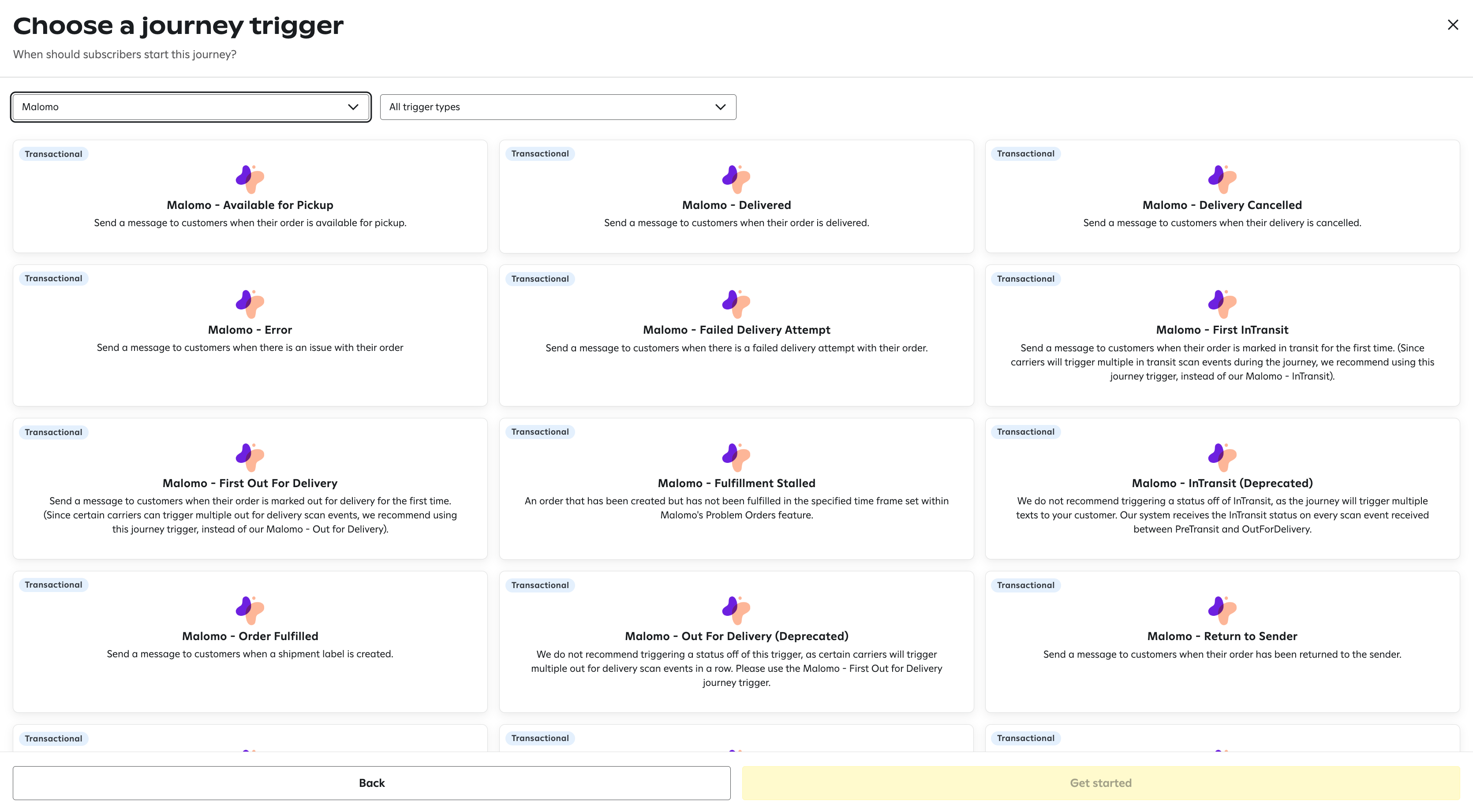 From here, you’ll see the full list of Malomo journey triggers available to use. See here for more information on each journey trigger.