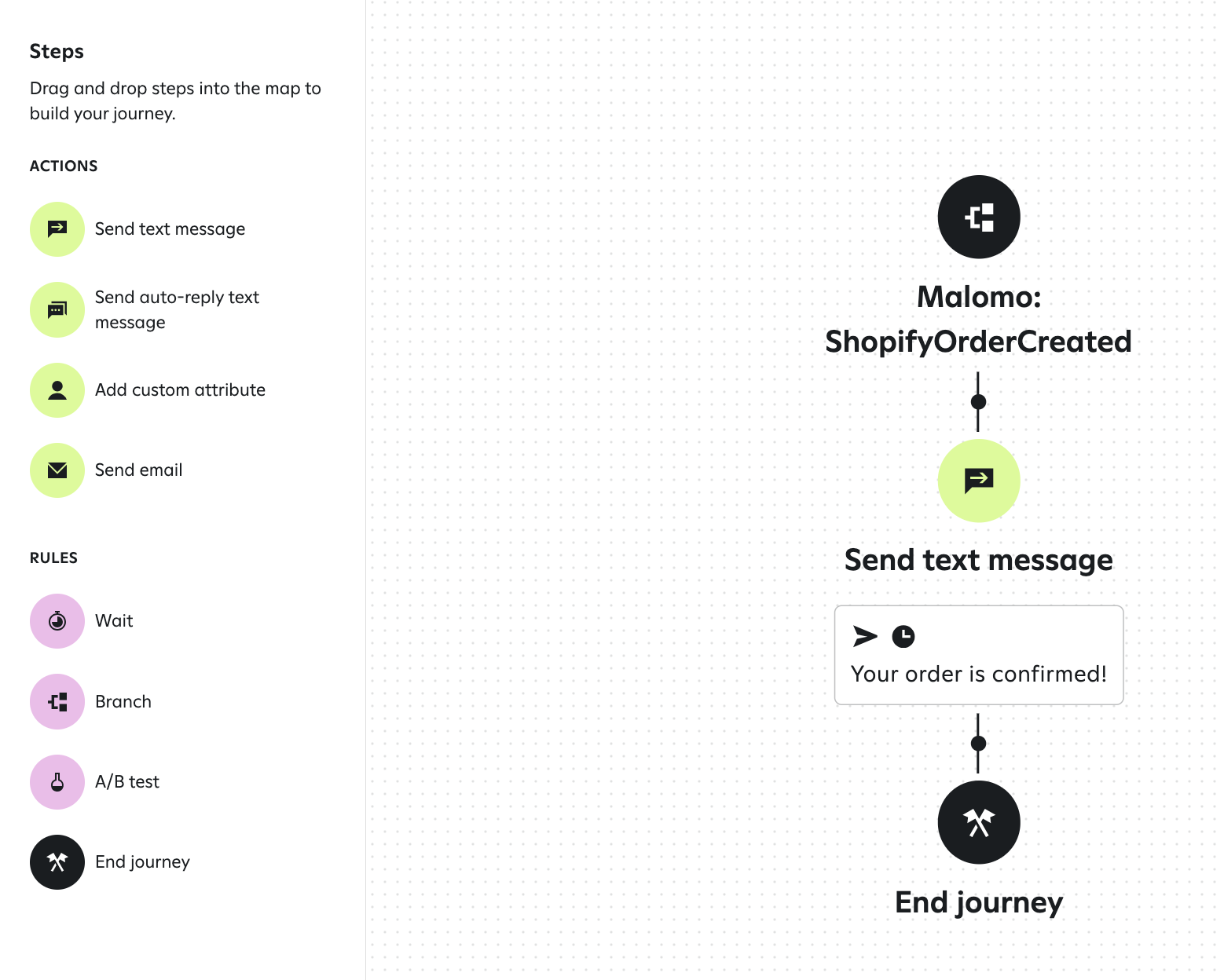 From here, your journey is now ready to be customized with actions. You may use Send Text Message and/or Send Email actions, as well as add rules such as time delays or branches.