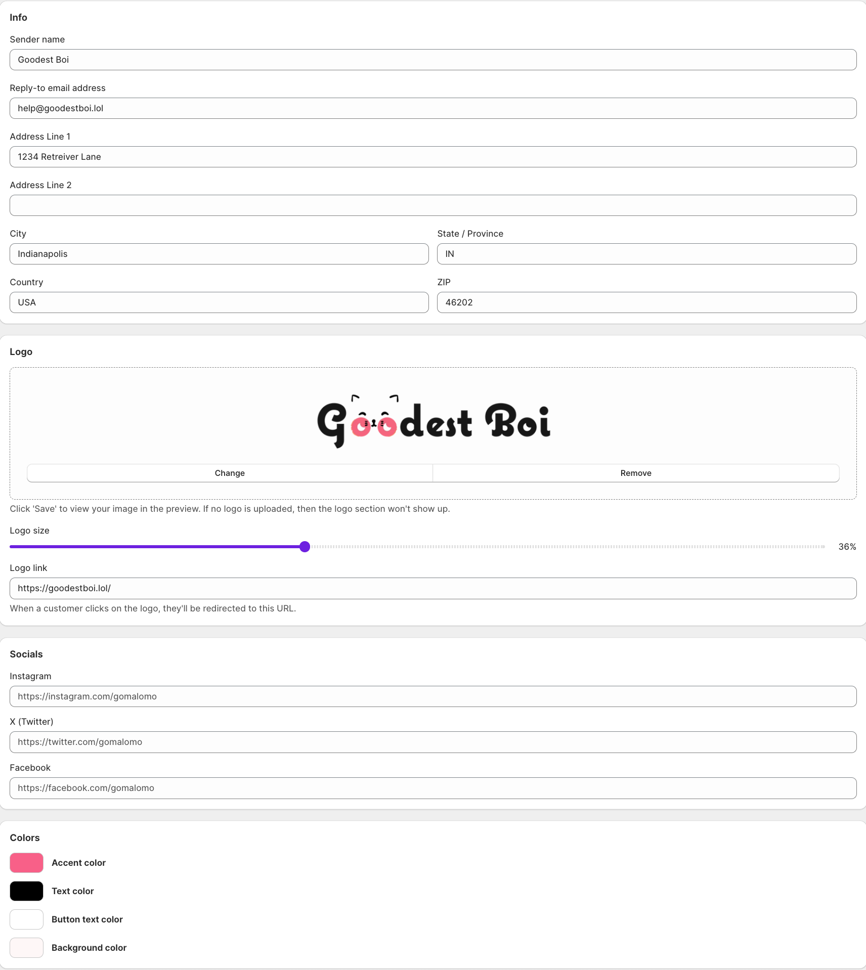 To begin sending Malomo Transactional emails, you’ll need to first customize your base email template. This will configure your logo, social links, and color styling across all email notifications, as well as allow you to set your sender name, reply-to email address, and business address.