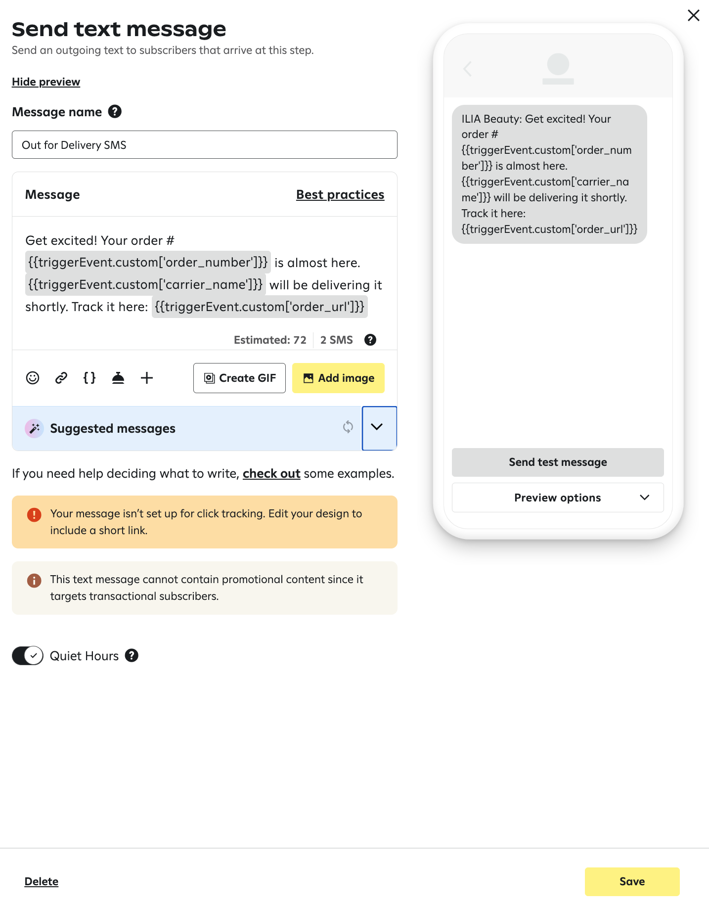 Since SMS messages don’t require much formatting and should be clear and concise, it’s easy to build the message copy while you’re building your Attentive journey.