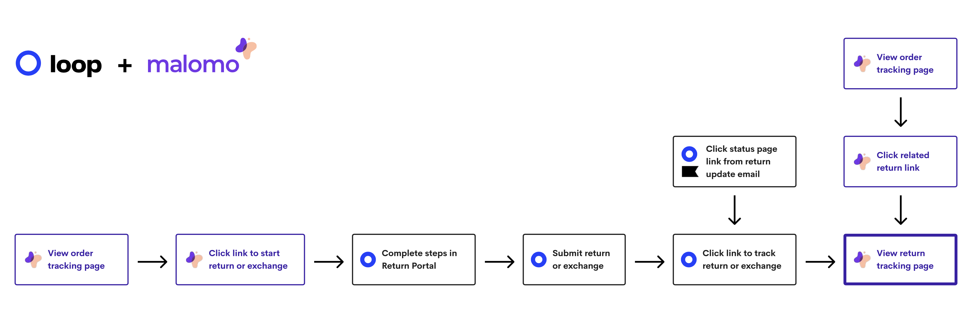Your existing Loop powered emails, whether in-app or via Klaviyo, will continue to link to the Loop Return Status page. However, the Loop Return Status page’s tracking link will now link directly to the Malomo return tracking page.