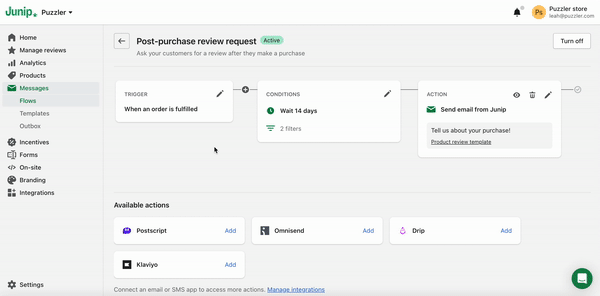 After installing the integration, update the Trigger event in your Junip Post-purchase review request flow so it uses 'Malomo - Order delivered'.