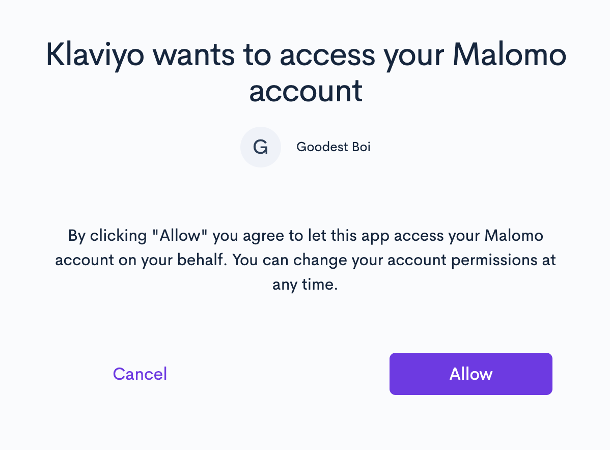 d. Grant Klaviyo access to your Malomo account information by clicking Allow.