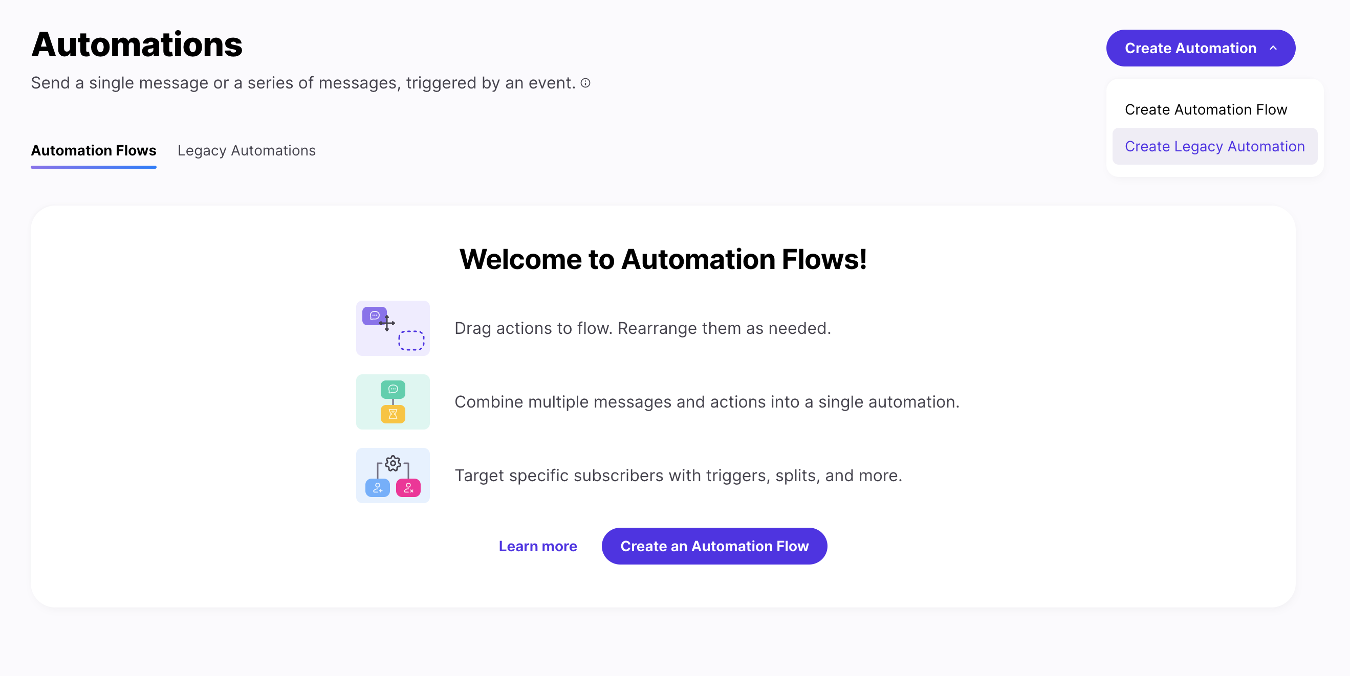 In your Postscript Dashboard, go to ‘Automations’ and click ‘Create Automation’. Click ‘Create Legacy Automation.’