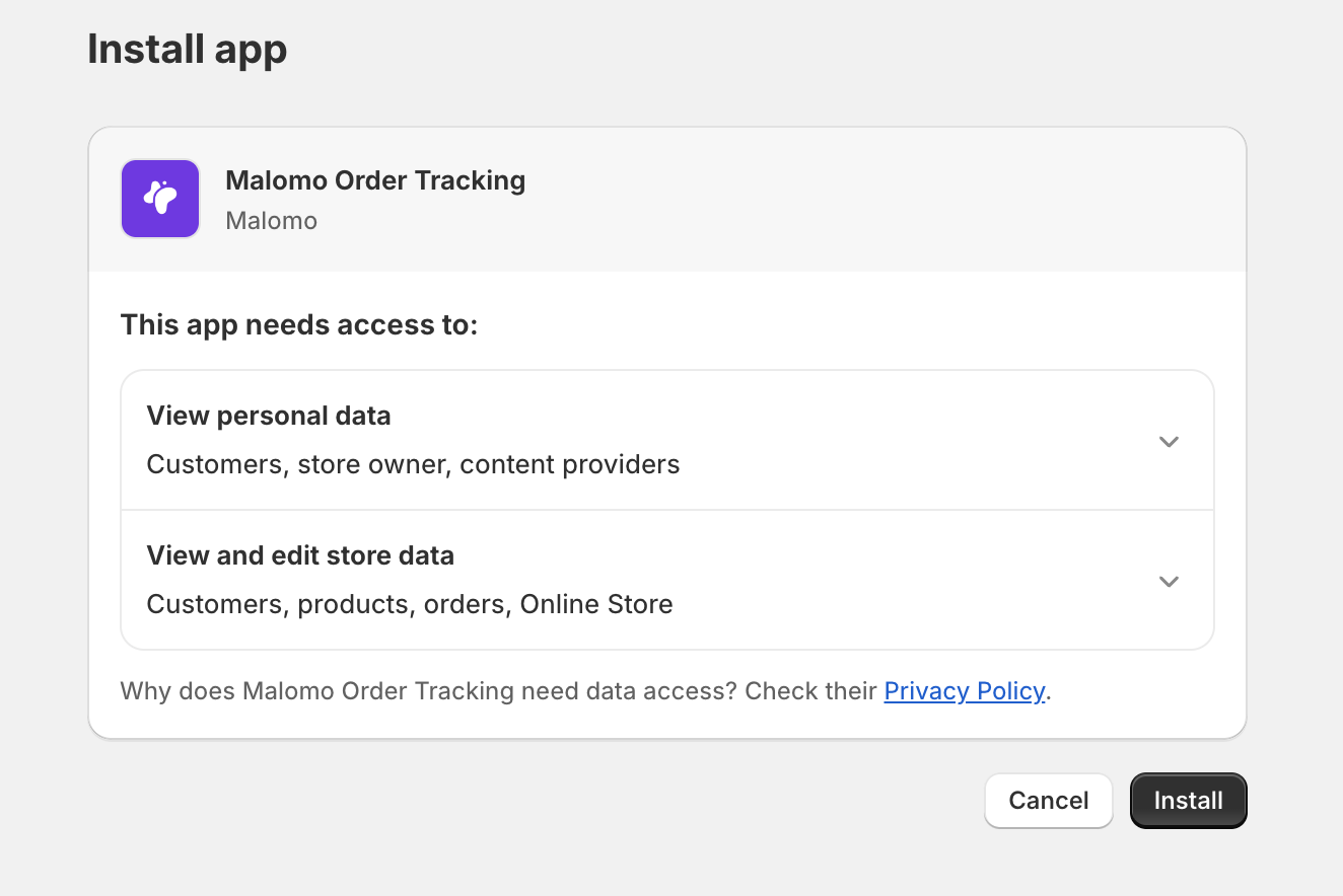 Once this is complete, you will be asked to allow Shopify to get Access to your Malomo Account. Click “Allow”.