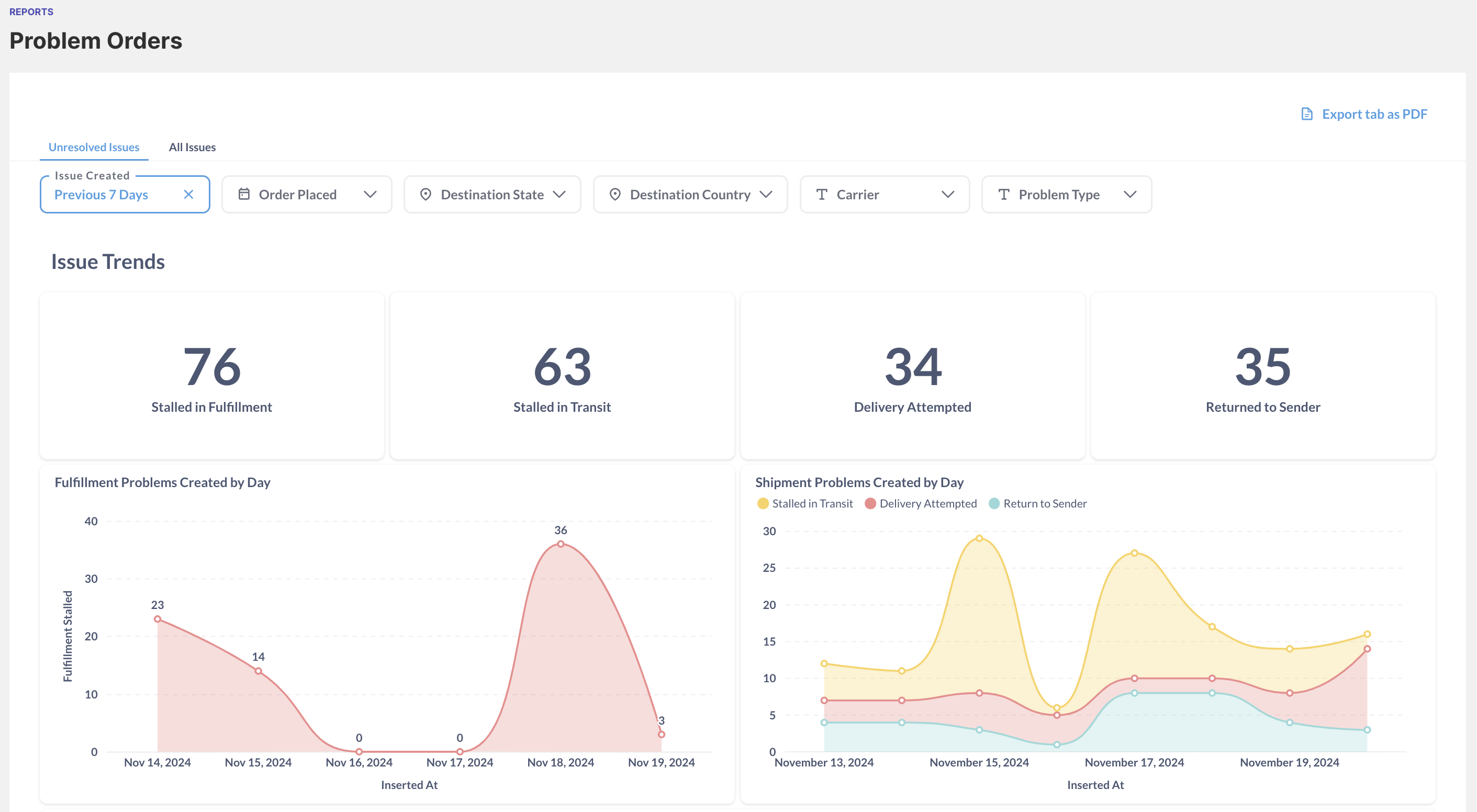 Use the filters at the top of the page to drill down by problem creation date, order creation date, destination location, problem type and carrier. Filters are “sticky”, meaning users can use any combination of these filters at any time.