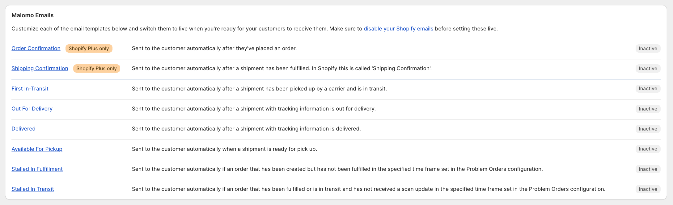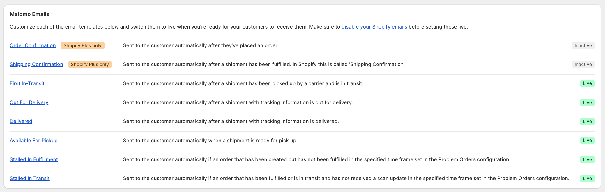 Please note, we do not recommend enabling the Order Confirmation and Shipping Confirmation emails unless you are on a Shopify Plus plan. Only Shopify Plus merchants can disable these notifications in Shopify. To learn more about this, please see our article on How to Disable Shopify Notification Emails. For Standard Shopify plan members, learn how to add our code snippet and link to your Malomo tracking page in these two default Shopify notifications here.