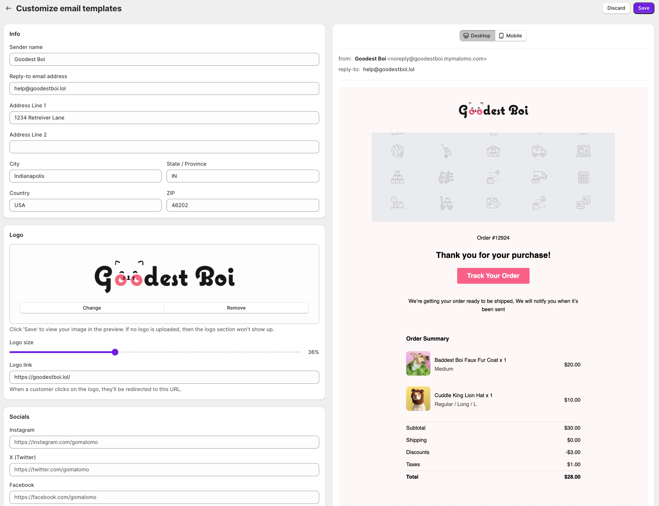 To begin sending Malomo Transactional emails, you’ll need to first customize your base email template. This will configure your logo, social links, and color styling across all email notifications, as well as allow you to set your sender name, reply-to email address, and business address.